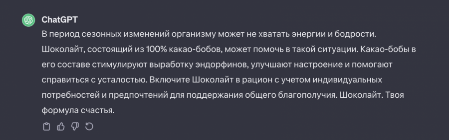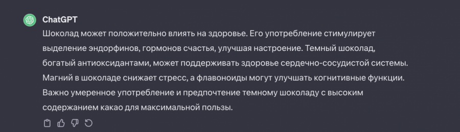 Обращаемся опять к СhatGPT и получаем обстоятельный ответ на вопрос: «Как шоколад влияет на здоровье?»