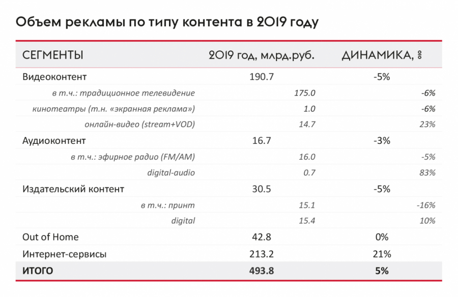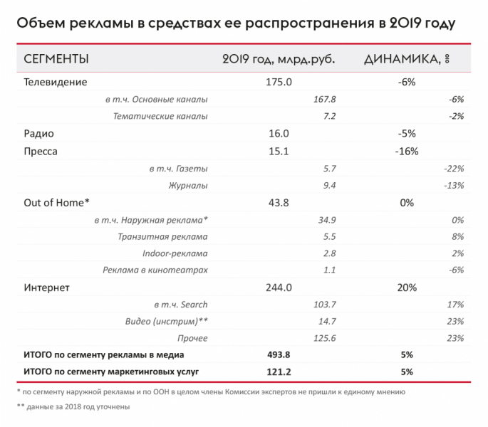 В 2018 году падение демонстрировала только пресса — расходы на рекламу в этом сегменте уменьшились на 12%, в то время как радио стагнировало, Out of Home показывал рост на 3%, а ТВ — на 9%. Однако в первом квартале 2019 года все изменилось — бюджеты на рекламу в традиционных медиа сокращались, а реклама на ТВ упала на 6%.
