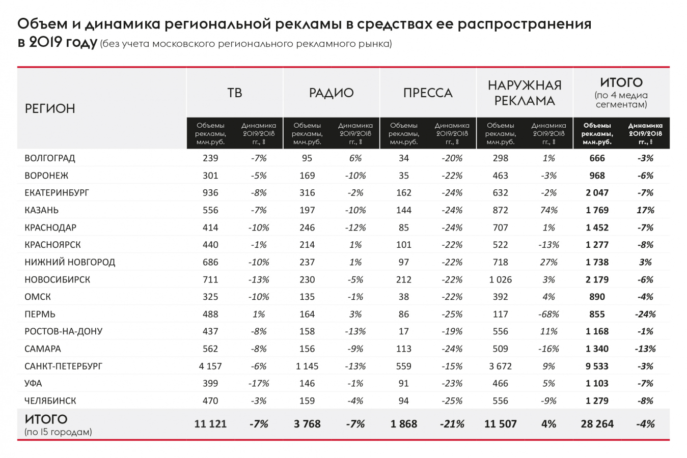 Суммарный объем рынка составил 28,3 млрд руб. По объему инвестиций на первом месте, с большим отрывом, находится Санкт-Петербург. На втором — Новосибирск, а на третьем — Екатеринбург. Большая часть бюджетов во всех городах приходится на ТВ и наружную рекламу. При этом, по сравнению с прошлым годом, бюджеты на ТВ-рекламу везде падают, а на наружную рекламу во многих городах растут. В целом по этим городам наблюдается негативная динамика -4%. В плюсе только Казань — их рекламные бюджеты увеличились на 17%. Во многом за счет наружки — в этом сегменте рост составил 74%.