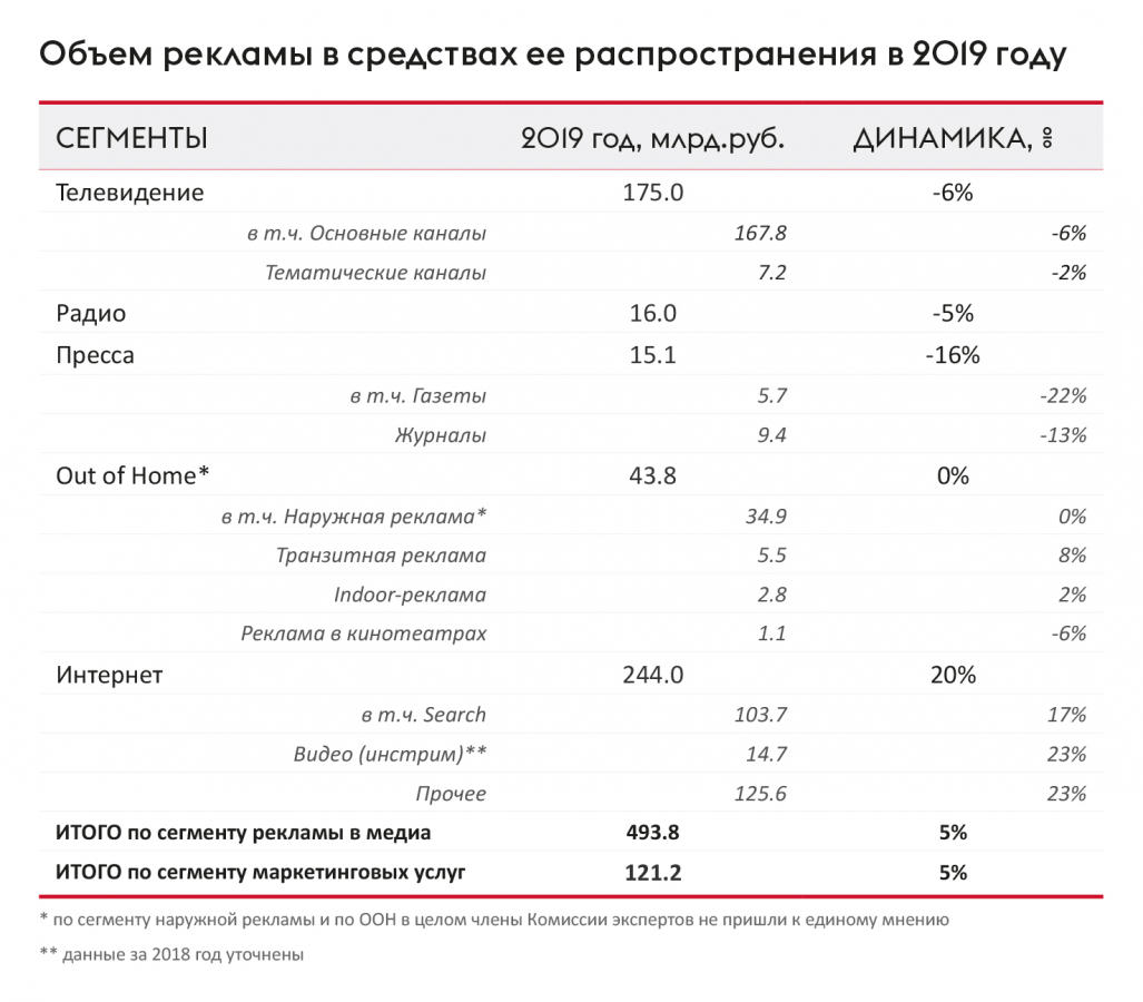 Объем маркетинговых услуг по итогам 2019 года превысил 121 млрд руб. — на 5% больше, чем в прошлом. С учетом рекламных бюджетов, израсходованных на создание креативных решений, на производство рекламной продукции и на оплату услуг рекламных агентств, суммарный объем российского рынка маркетинговых коммуникаций, по подсчет АКАР, составил примерно 850−870 млрд руб.