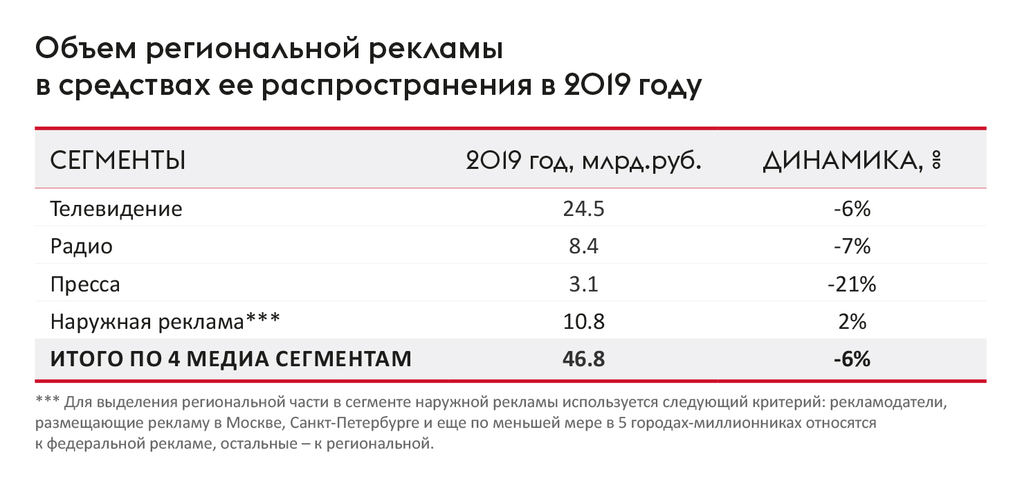 Суммарный объем региональных бюджетов за 2019 год составил 46,8 млрд.руб., что на 6% меньше аналогичного показателя 2018 года. Все сегменты, за исключением наружной рекламы, показали падение.