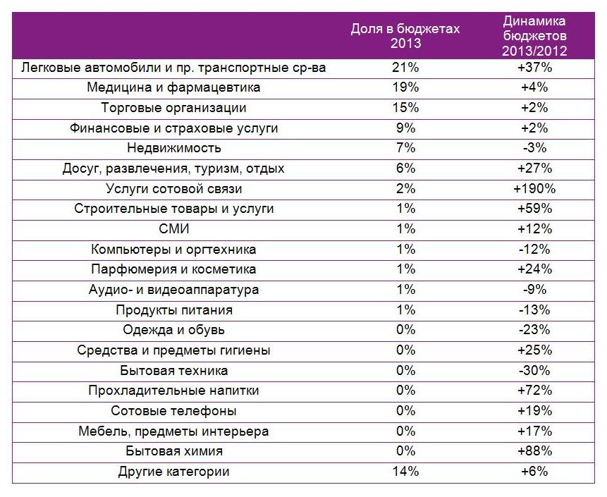В 2013 г., как и в 2012, реклама на радио росла быстрее, чем рынок ATL-рекламы в целом. Пятерка товарных групп - лидеров по бюджетам на радио - не изменилась. Это автомобили, медицина и фармацевтика, торговые организации, финансовые и страховые услуги и недвижимость. Наиболее динамично росла категория «Услуги сотовой связи», чьи бюджеты сформированы тремя крупнейшими игроками – Билайном, МТС и Мегафоном.
