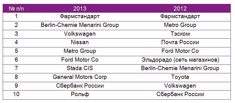 Что касается ТОП 10 крупнейших рекламодателей, то список 2013 г. в значительной части повторяет список прошлого года.