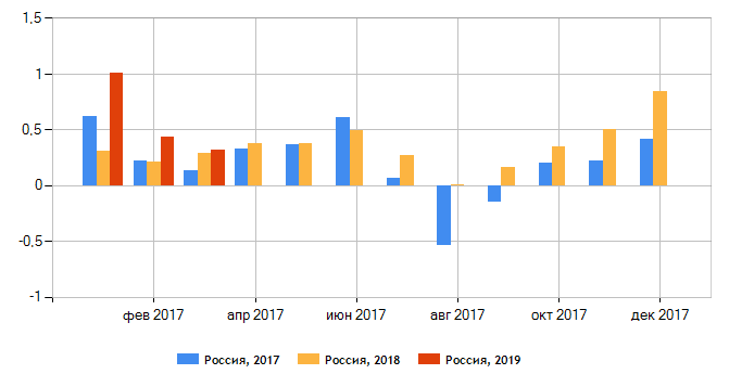 И это, конечно, плохие новости. Рост средней заработной платы, зафиксированный Росстатом в том же периоде, ничего не меняет — цены росли быстрее. Как результат — уровень инфляции в первом квартале 2019 года составил 1,78 или 7,12 в годовом исчислении. Для сравнения: уровень инфляции в 2018 году составлял 4,27, а в 2017 — 2,52.