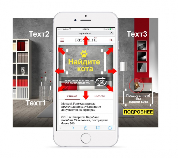 Необычный баннер со встроенным в контент панорамным изображением 360 градусов. При смене положения смартфона происходит перемещение картинки в панорамном режиме. В конце пользователю предлагается перейти на лендинг продукта.Баннер можно использовать для различных простых квест-механик, когда нужно найти тот или иной продукт.
