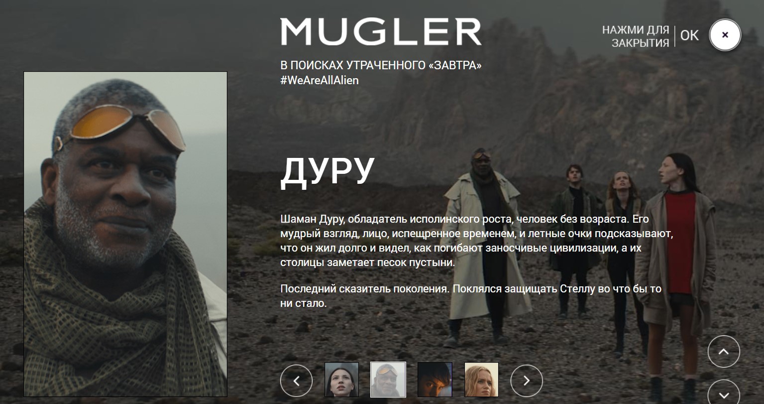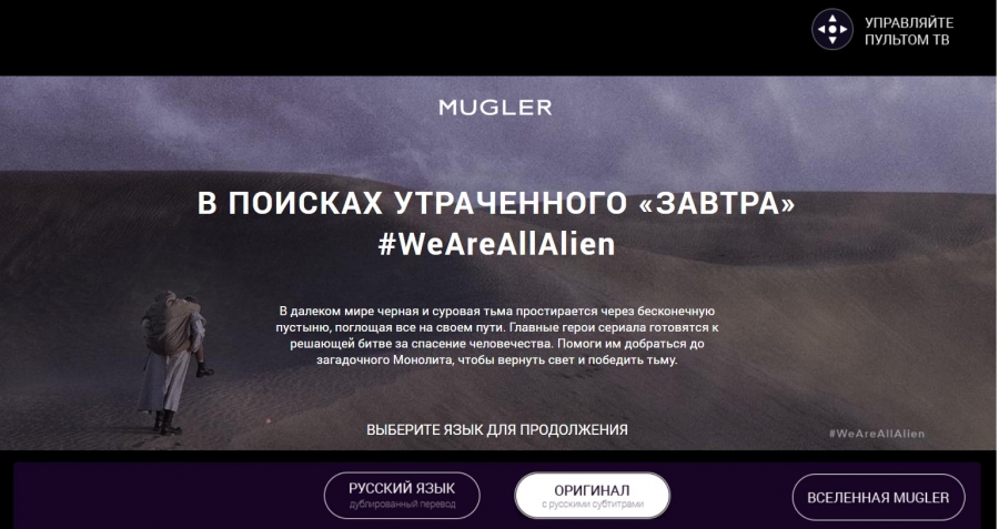 Плеер ivi был доработан для бесшовного смотрения и навигации по сериалу. В ключевые моменты просмотра появлялись интерактивные задания на сообразительность, внимательность и скорость реакции, помогающие героям двигаться по сюжету. На протяжении всего просмотра пользователь мог перейти во «Вселенную MUGLER», интегрированную в сериал промо-зону, с информацией о новых ароматах бренда. Управлять вселенной можно было с помощью привычного пульта от Smart TV