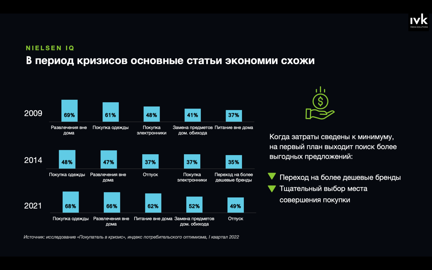 От чего потребители откажутся, а чему начнут искать доступные по карману альтернативы, можно предугадать, изучив показатели предыдущих кризисов (здесь мы опираемся на данные, собранные Nielsen IQ):