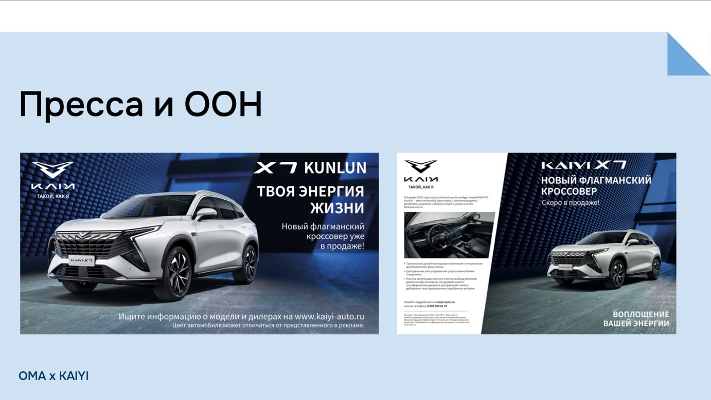 На основе получившейся стратегической части агентство начало работать над креативной. Разработка этой части кампании для KAIYI X7 Kunlun велась сразу в нескольких направлениях в очень сжатые сроки. За 9 дней команда ОМА сделала большой пул работ, включающий: TV/OLV ролик и дополнения в виде диджитал-форматов, материалов для прессы и OOH.