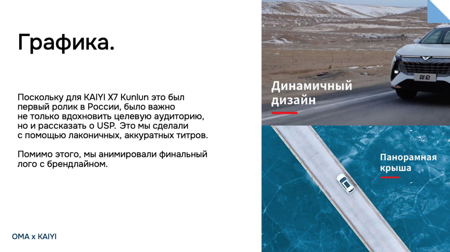 Для визуального ряда команда креативного агентства ОМА выбрала и замиксовала сцены, отснятые на горном хребте Куньлу́нь из исходников китайских коллег. Кадры выстроились в харизматичную историю, что закрыло задачу с адаптацией материалов для российского рынка. С помощью графики в ролике слинковали уникальные преимущества автомобиля в титрах с закадровым голосом, сохранив художественность повествования. Музыкальное и звуковое сопровождение также сыграло важную роль в ролике.