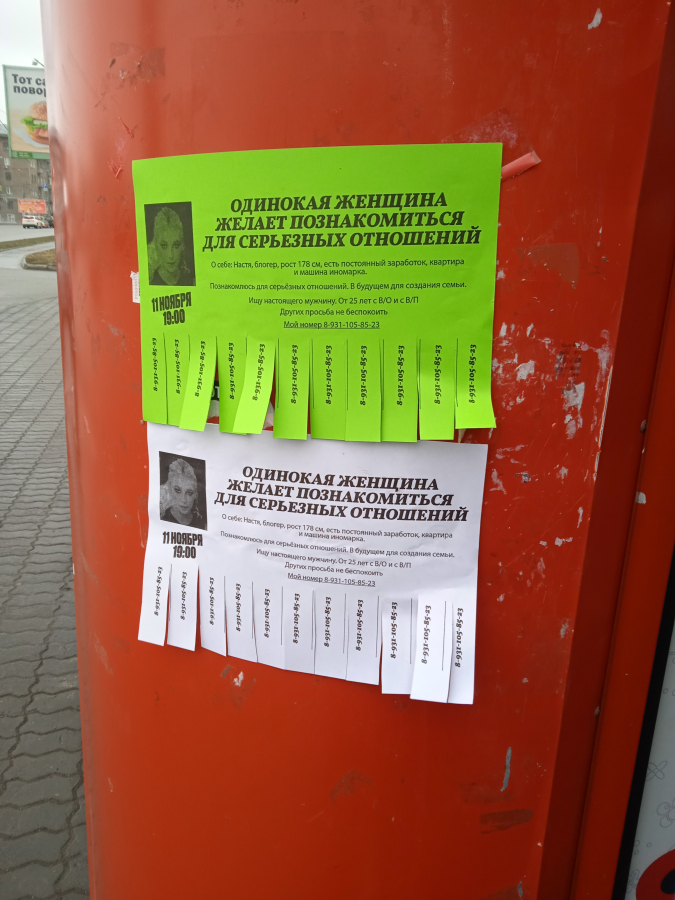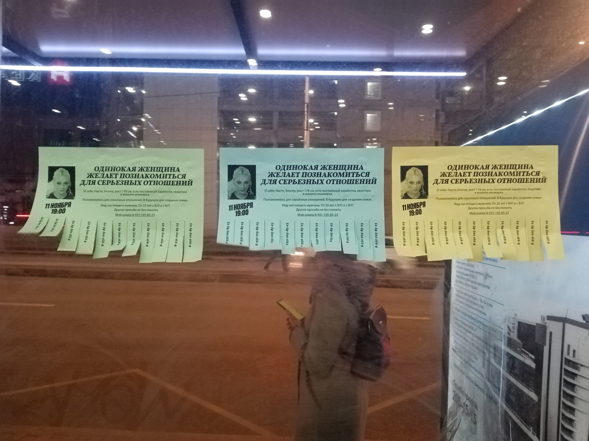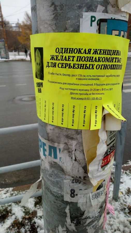 Жители Екатеринбурга, Челябинска, Красноярска, Уфы, Новосибирска и Перми заметили необычные объявления в общественных местах своих городов — на них сообщалось, что блогер Настя Ивлеева ищет спутника жизни.
