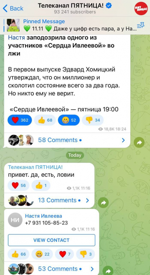 Позже этот же телефон Насти «слили» в Telegram-канал «Пятницы!»