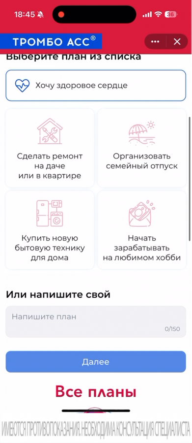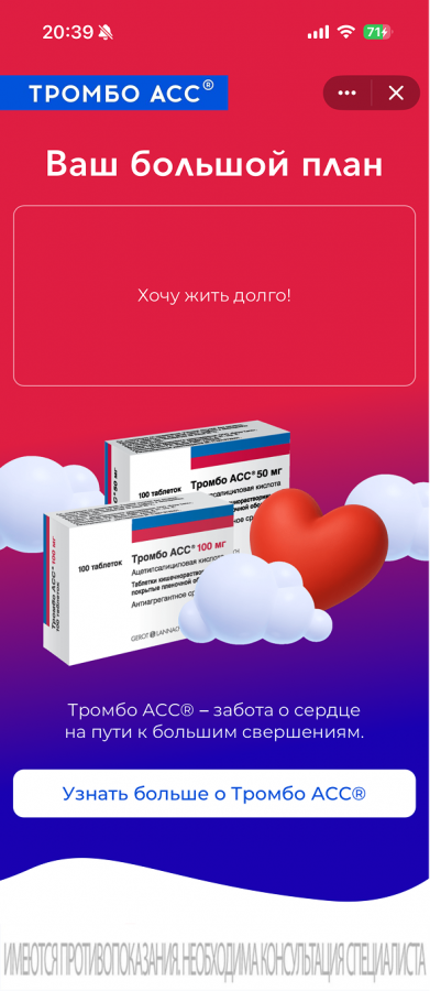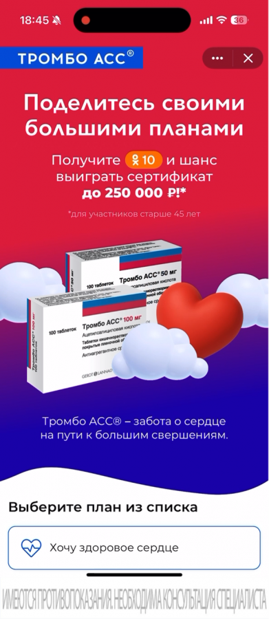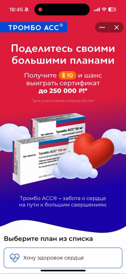 В приложении пользовательский сценарий сочетался с частым присутствием упаковки «Тромбо АСС» в интерфейсе — это помогало решать задачи узнаваемости продукта.