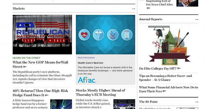 Эксперты выставляли оценки по нескольким критериям: какую терминологию использует издание, видимость и читабельность текста, а также как отделяется спонсируемый материал от остального содержимого. Например, OTA очень понравилась нативная реклама на главной странице сайта Wall Street Journal. Там присутствовала хорошо заметная, контрастная маркировка (Paid program) и логотип спонсора (в данном случае Aflac), блок был выделен другим цветом. Там же содержалась информация о Paid program.
