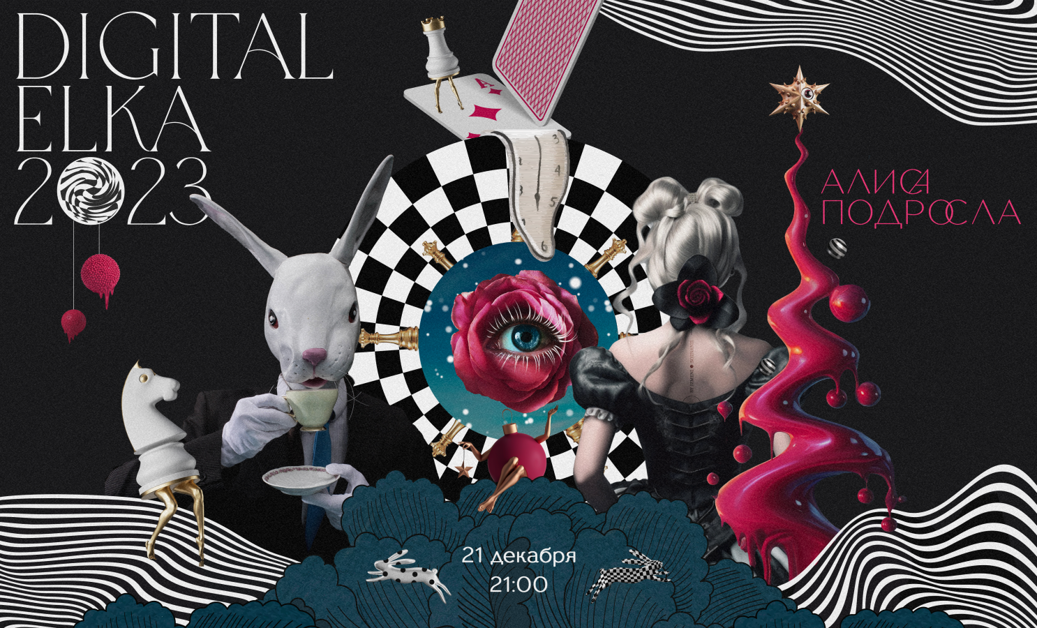 Концепция Digital Elka 2023 — «Алиса подросла», в рамках которой каждый участник может пофантазировать на тему мира взрослой Алисы в стране чудес. Пространство особняка будет поделено на множество тематических интерактивных зон. За музыкальную часть будут отвечать: электронный дуэт Geju, Виталий Козак, Monoplay, Софья Родина, Андрей Чагин и Кирилл Зубов.