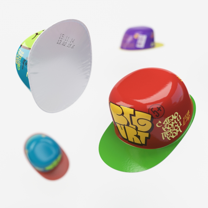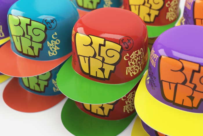 Концепция дизайна упаковки в виде большой кепки родилась из любви детей к подражанию. Креатор решил использовать проамериканский образ крутого парня: большая кепка, широкие штаны, майка большого размера. Яркие упаковки с надписями в стиле граффити являются курсовым проектом дизайнера для БШВД.