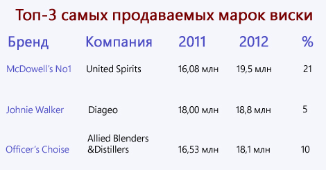 Johnnie Walker уступает звание самого продаваемого виски мира впервые за последние 10 лет. Эксперты уверены – если тенденция сохранится, в следующем году бренд может оказаться и вовсе на третьей строчке, уступив еще одной марке индийского виски - Officer’s Choice (Allied Blenders & Distillers’). Рост его продаж в 2012 году составил 10% (18,1 млн кейсов), а за последние шесть лет бренд вырос на 22%.