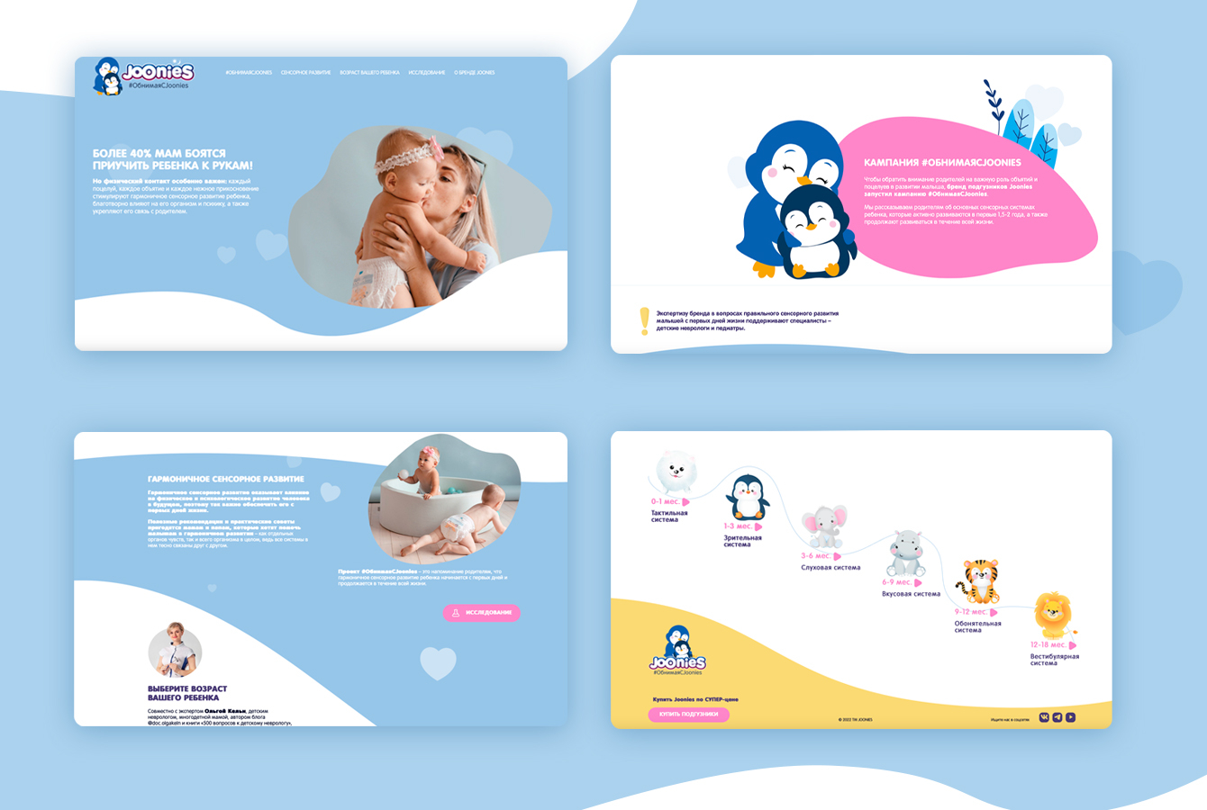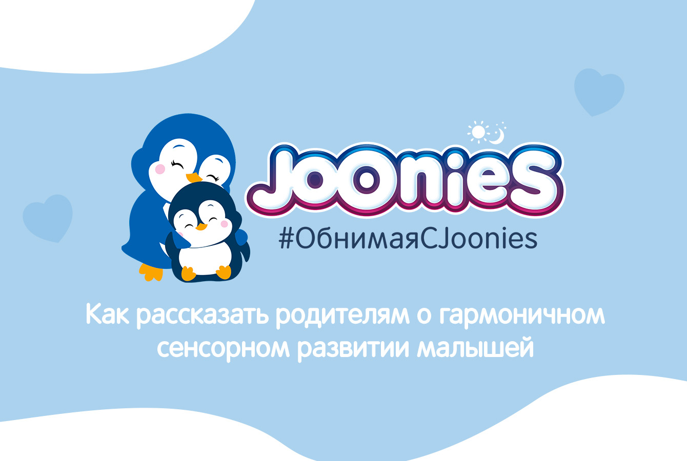 Наш клиент, производитель подгузников Joonies, хотел усилить своё позиционирование в качестве эксперта в области материнства и детства для того, чтобы повысить узнаваемость компании и лояльность к ней ЦА (родителей детей до трёх лет). Для достижения этой цели мы предложили бренду запустить социальную образовательную кампанию #ОбнимаяСJoonies, посвящённую гармоничному сенсорному развитию малышей — актуальной и перспективной теме, ещё «не занятой» другими брендами. Клиент одобрил нашу идею.