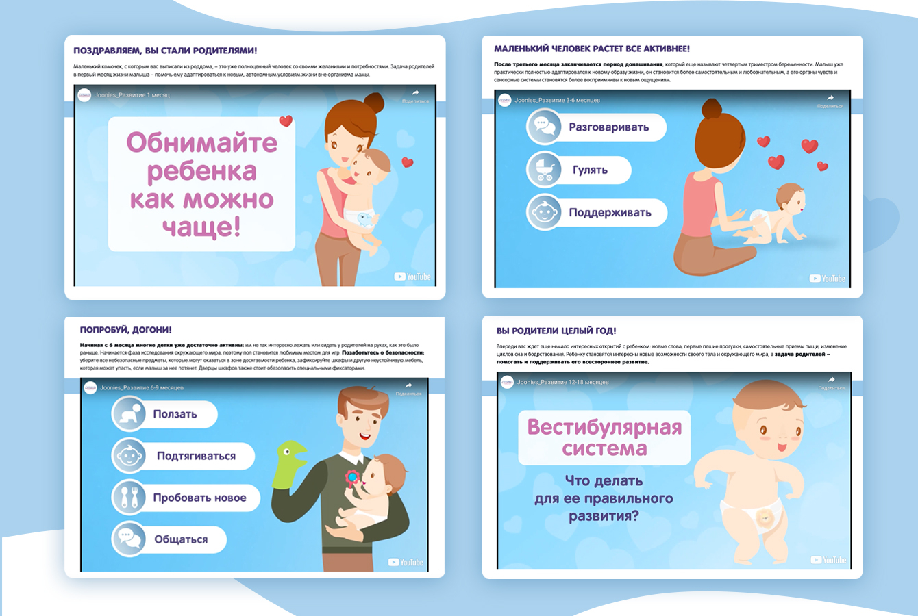 На этом портале родители малышей могут найти информацию и практические рекомендации, посвящённые сенсорному развитию детей в разные возрастные периоды, каждому из которых посвящён свой раздел («0−1 мес.», «1−3 мес.», «3−6 мес.», «6−9 мес.», «9−12 мес.», «12−18 мес.») и своё животное-символ с подгузников Joonies (щенок, пингвинёнок, слонёнок, бегемотик, тигрёнок и львёнок).