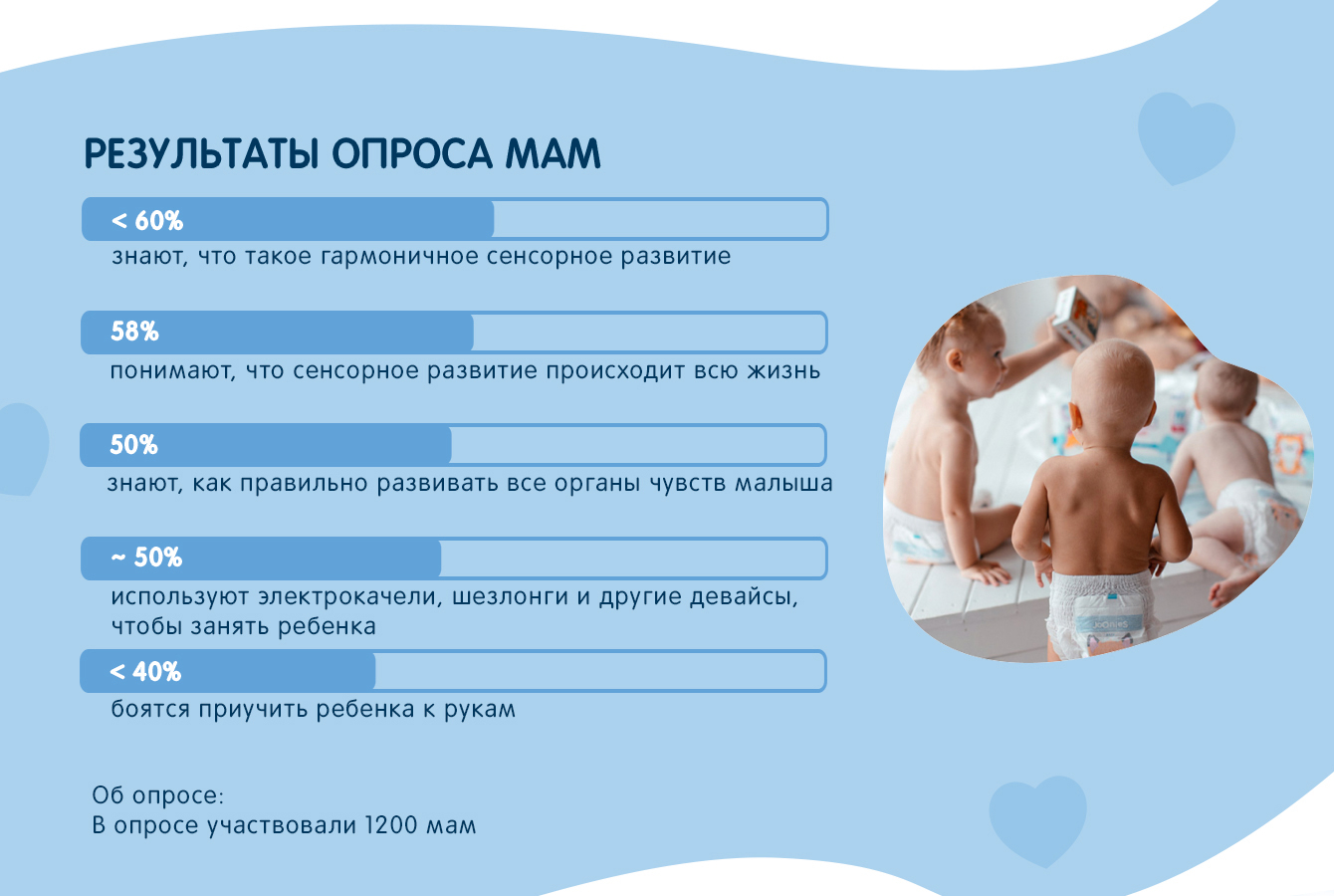 Результаты исследования подтвердили актуальность выбранной нами темы: как выяснилось, сегодня большинство мам малышей в целом представляет, что такое гармоничное сенсорное развитие, однако половина из них не знает, как именно стимулировать его на каждом возрастном этапе.