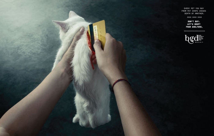 Рекламное агентство Manajans JWT создало принты, нацеленные на покупателей породистых питомцев. Шокирующие изображения заказала турецкая Ассоциация волонтеров из приютов и прав животных. Реклама демонстрирует, что каждый клиент зоомагазина лишает бездомное животное шанса на нормальную жизнь. Ассоциация призывает искать друга в приютах.