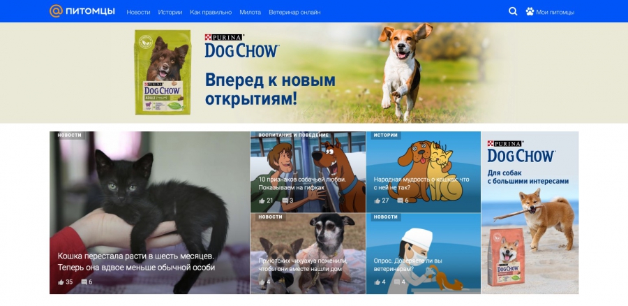 Для того чтобы контент был интересен аудитории, лучше довериться редакции, которая будет готовить интересные и читаемые материалы. Бренд может нативно интегрировать ключевые сообщения в статьи и интерактивные форматы — тесты, викторины, развлекательные разделы. Кроме того, на медиаплатформе можно создать полезные рубрики, которые будут подчеркивать экспертизу компании. Так, в Питомцах Mail.ru есть раздел «Ветеринар-онлайн», в рамках которого эксперты Purina в режиме реального времени отвечают на вопросы аудитории о домашних животных.
