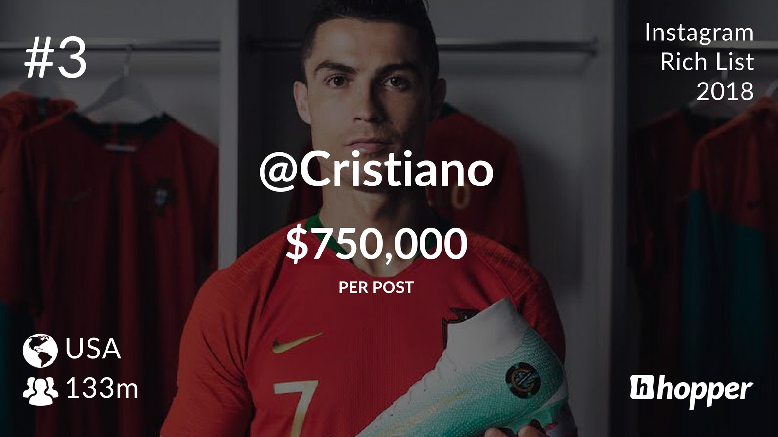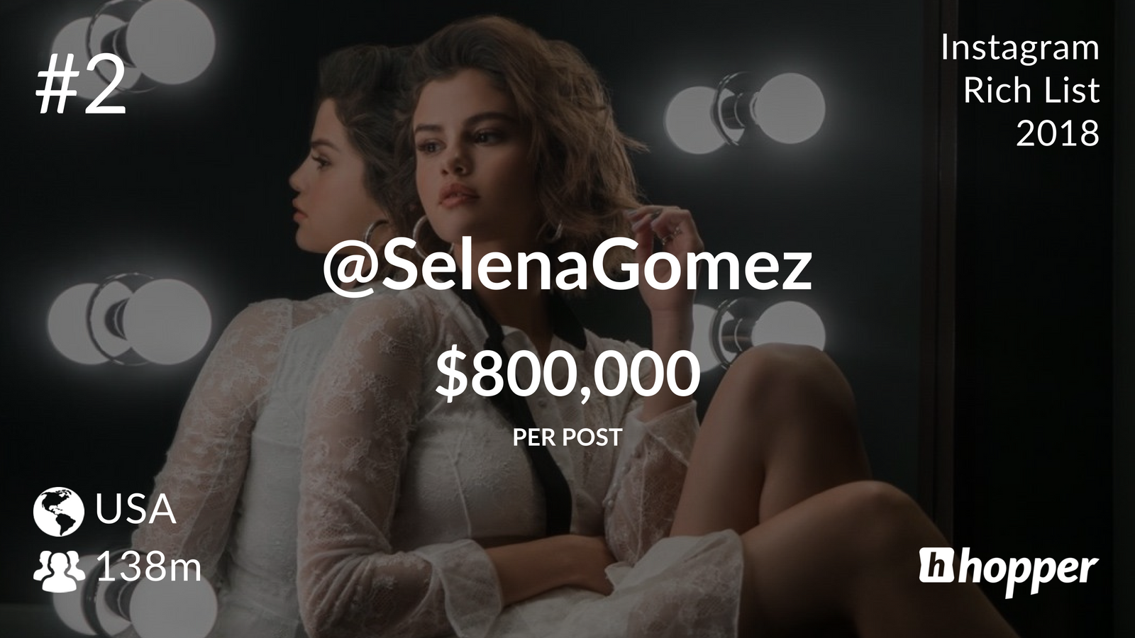 Селена Гомез опустилась на второе место, рекламный пост в ее блоге оценивается в 800 тысяч долларов. При этом аудитория Гомез больше, чем у конкурентки — 138 млн пользователей. На третьем месте находится футболист Криштиану Роналду, которому бренды готовы выложить до 750 тысяч долларов за коллаборацию. Ким Кардашьян получает 720 тысяч долларов за публикацию, а замыкает первую пятерку Бейонсе (700 тысяч долларов).