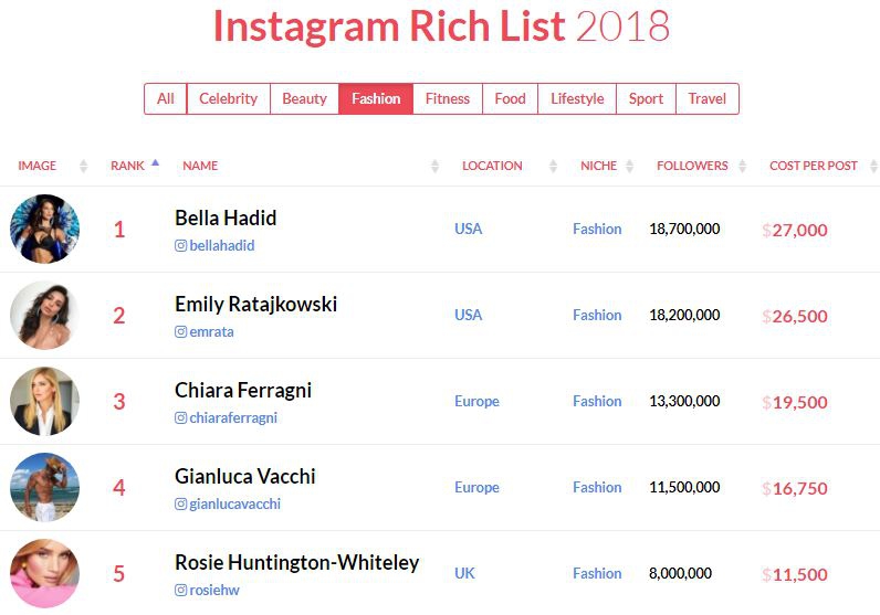 В Instagram Rich List также можно посмотреть самых успешных блогеров в различных категориях: красота, мода, фитнес, еда, спорт, путешествия, образ жизни.