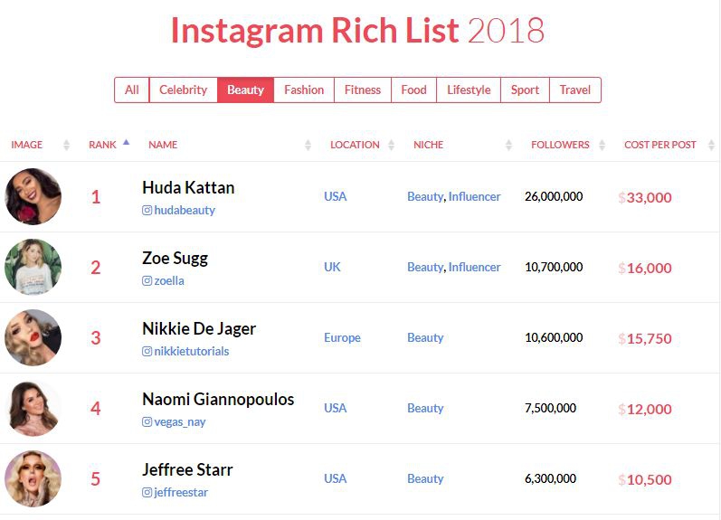Если посмотреть на доходы «обычных» инфлюэнсеров, а не знаменитостей, то здесь пятерка лидеров выглядит следующим образом: бьюти-блогер Худа Каттан (33 тысячи долларов за пост), «звезда интернета» Элеонора Понс (32 тысячи), «гений видеомонтажа» Зак Кинг (30 тысяч), видеоблогер Кэмерон Даллас (25 тысяч), фитнес-модель Соммер Рэй (20 тысяч).