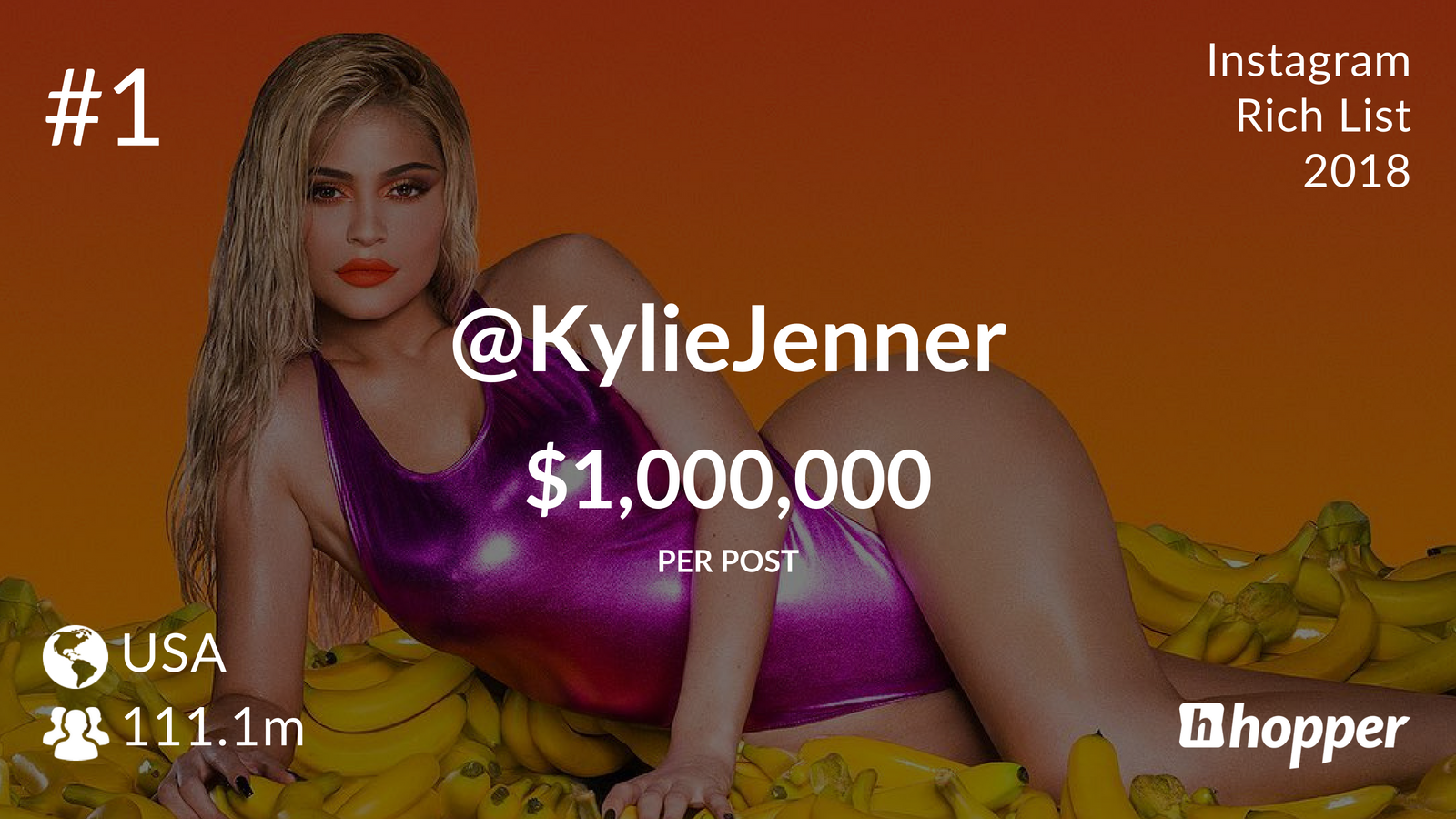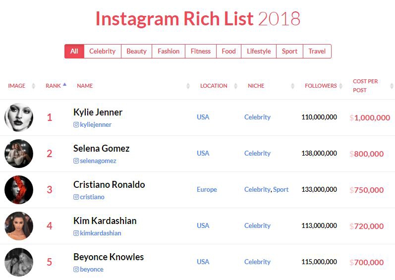 Год назад Кайли Дженнер находилась на четвертом месте и зарабатывала на каждой спонсорской публикации 400 тысяч долларов. Теперь она возглавляет Instagram Rich List, а каждый рекламный пост приносит ей до 1 млн долларов. Аудитория Дженнер в соцсети составляет 110 млн пользователей.