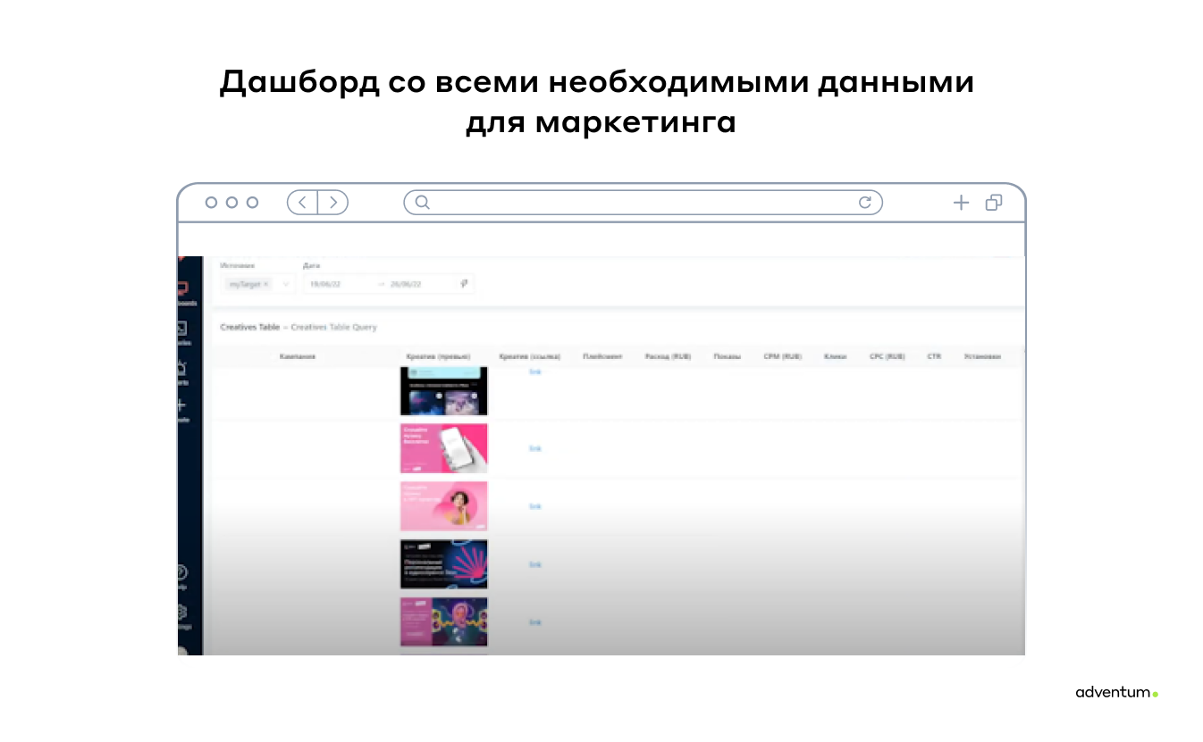 Плюс — возможность (из коробки) подтягивать на дашборд ссылки на креативы и выводить сами изображения.