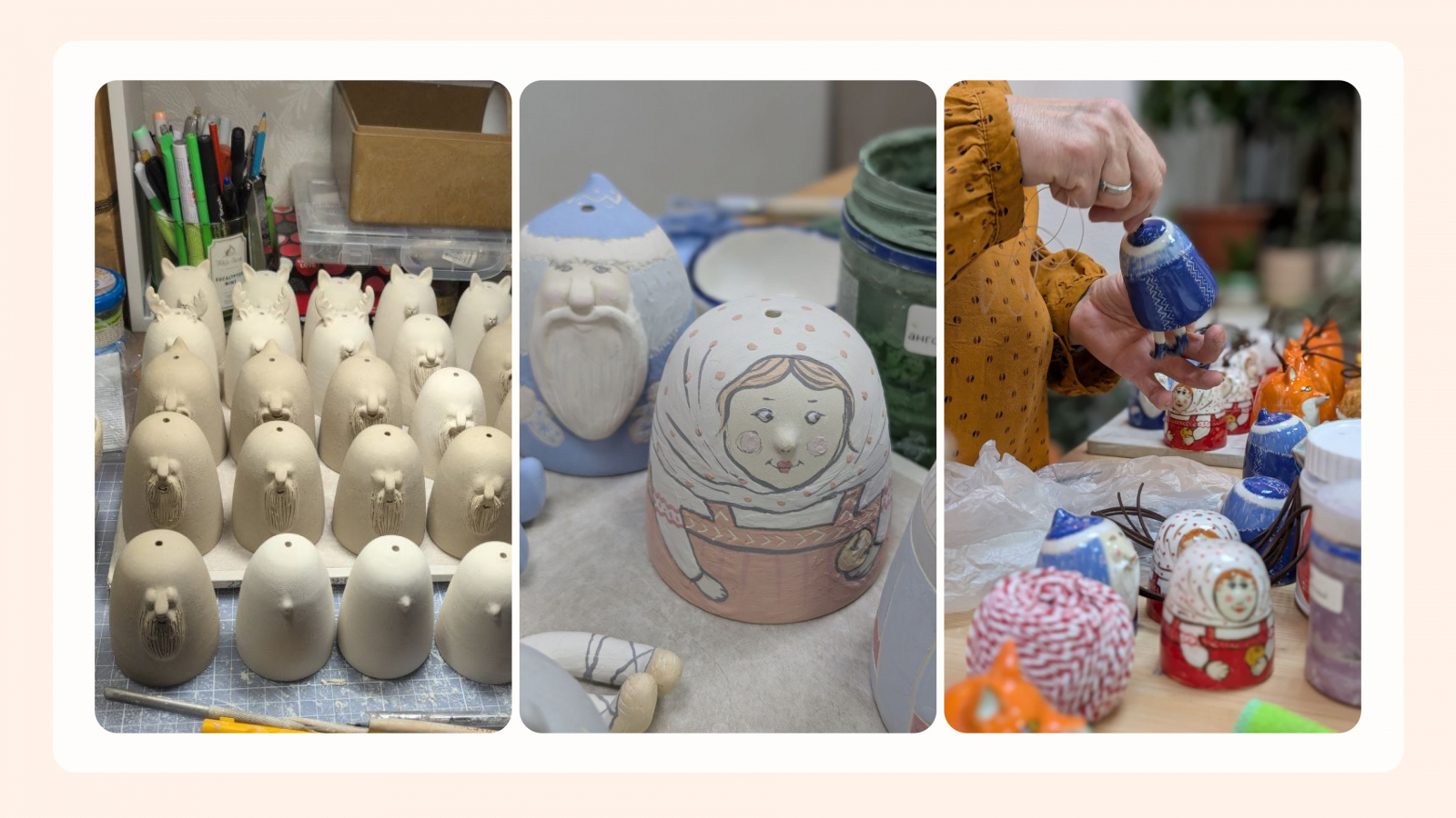 Большую часть времени заняла роспись игрушек. Нам удалось оптимизировать процесс в переносе карандашного изображения на колокольчик, а также удобно было иметь сразу готовый колер и закрашивать фоновые цвета партиями. Поэтому в работе у нас одновременно было по 5−10 игрушек одного персонажа.