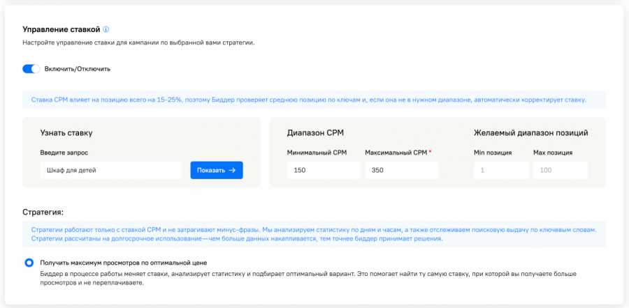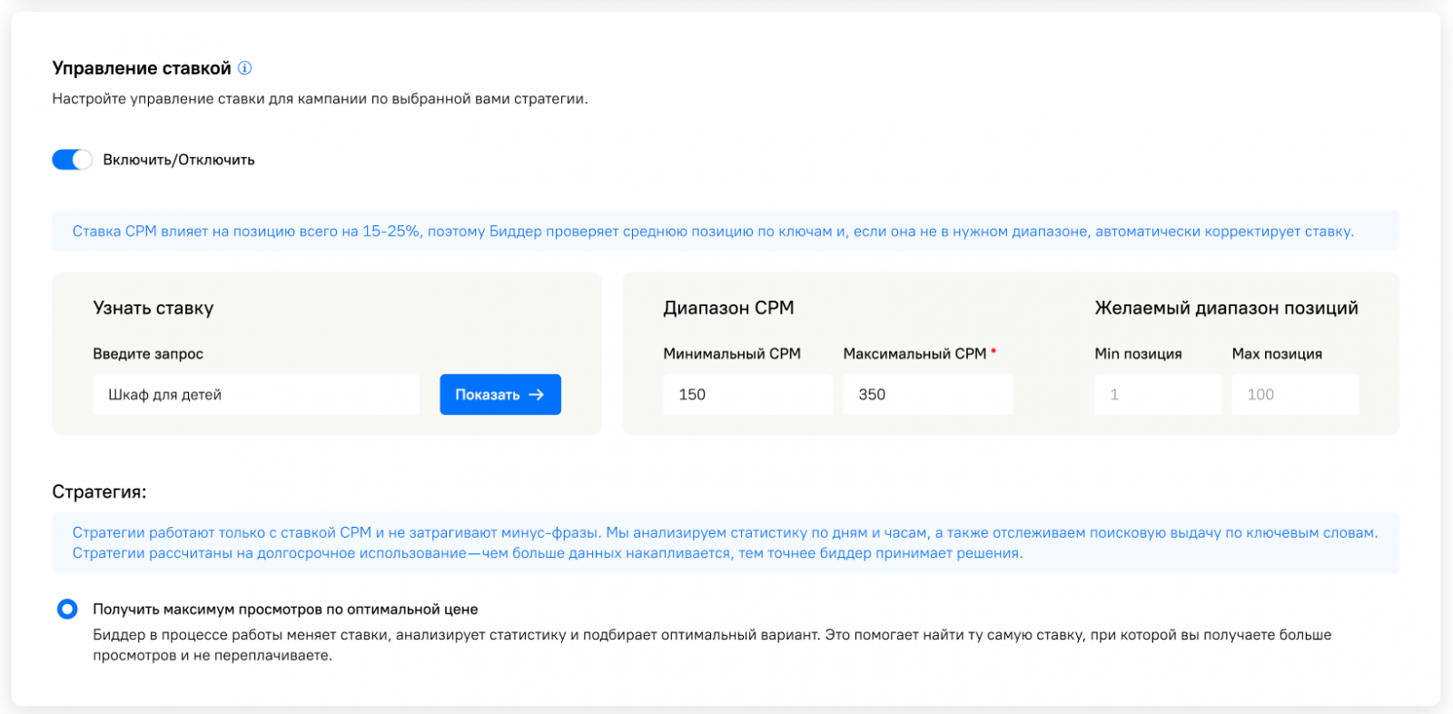 Стратегия работает только со ставкой CPM (цена за 1 000 показов) и не затрагивает минус-фразы. Биддер учитывает статистику по дням и часам, а также отслеживает поисковую выдачу по ключевым словам. Стратегии рассчитаны на долгосрочное использование — чем больше данных накапливается, тем точнее биддер принимает решения. При необходимости можно задать настройки диапазона СРМ или позиций в выдаче.