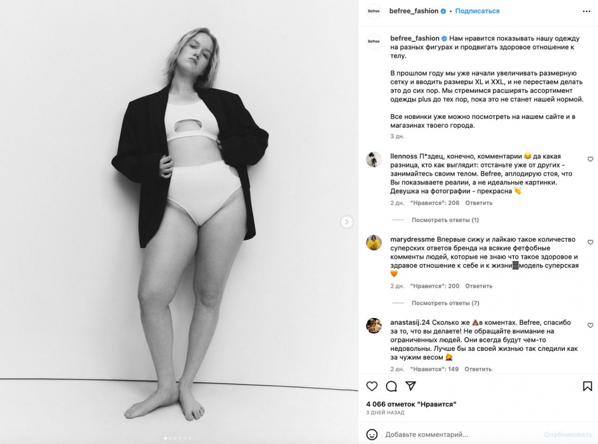 Также проверка неотвеченных комментариев помогает в нестандартных ситуациях, например, если какая-то рекламная кампания завирусилась. Так, в 2023 году вызвала резонанс плюс-сайз фотосессия в соцсетях Befree. Для бренда было важно экологично и корректно защитить и свои ценности, и моделей, поэтому они очень тщательно выверяли все формулировки и модерировали комментарии, удаляя только оскорбления и хейт. Кстати, здесь также важную роль сыграло сообщество вокруг бренда.