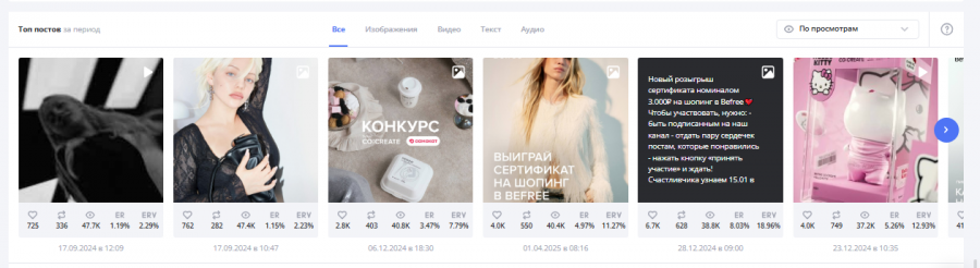 В fashion-индустрии тренды меняются со скоростью света, поэтому бренд не может себе позволить держаться за устаревшие форматы. При помощи инструмента Топ постов в LiveDune команда Befree понимает, что работает в соцсетях, а какие тренды уже выдыхаются.