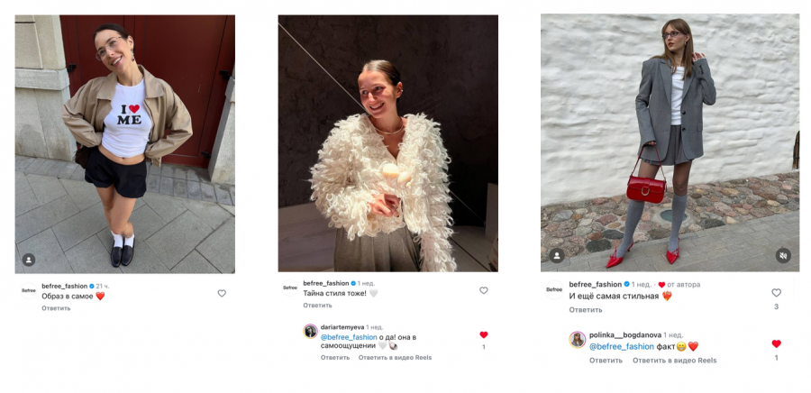 Бренд активно взаимодействует со своей аудиторией в соцсетях. Часть взаимодействия происходит в комментариях, где пользователи могут задать любой вопрос и просто пообщаться с единомышленниками. Также ребята активно отвечают на отметки в соцсетях. Befree также использует в продвижении UGC-контент (контент, созданный пользователями). Например, регулярная рубрика в соцсетях компании: Befree Community, в которой Befree репостит фотографии людей в одежде бренда. И это становится еще одним подтверждением философии сотворчества, где бренд — это про людей.