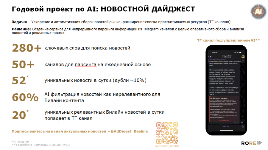 Каждый понедельник RORE Group отправляла команде «билайн» новостной дайджест. В течение недели несколько человек вручную мониторили десятки источников: новости digital, телеком-рынка, технологий, маркетинговые исследования, кейсы, изменения в законодательстве и многое другое. Каждую новость анализировали на релевантность запросам клиента. В итоге на подготовку одного письма с дайджестом уходило около 13 часов в неделю — почти два полных рабочих дня.