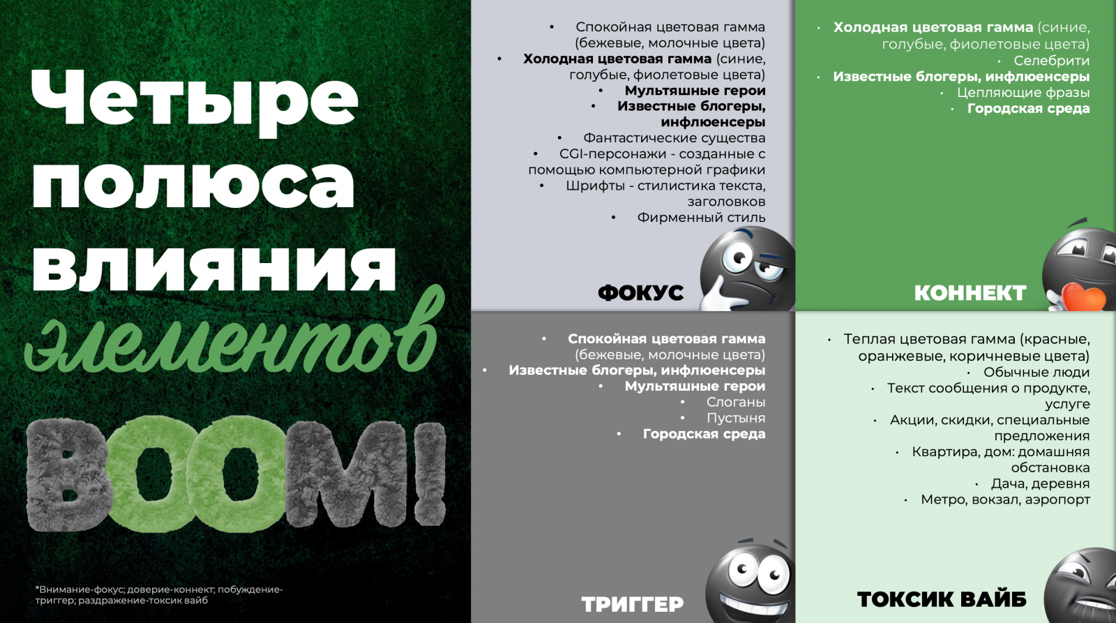 Для достижения максимального одобрения со стороны подростков, так называемого «слей»-эффекта, эксперты рекомендуют выстраивать коммуникацию вокруг четырех точек влияния. Во-первых, особое значение имеет визуальный код: подростков привлекает либо максимально спокойные оттенки (бежевый, молочный), либо холодная технологичная гамма (голубой, фиолетовый). При этом востребованы образы фантастических существ и CGI-персонажей.