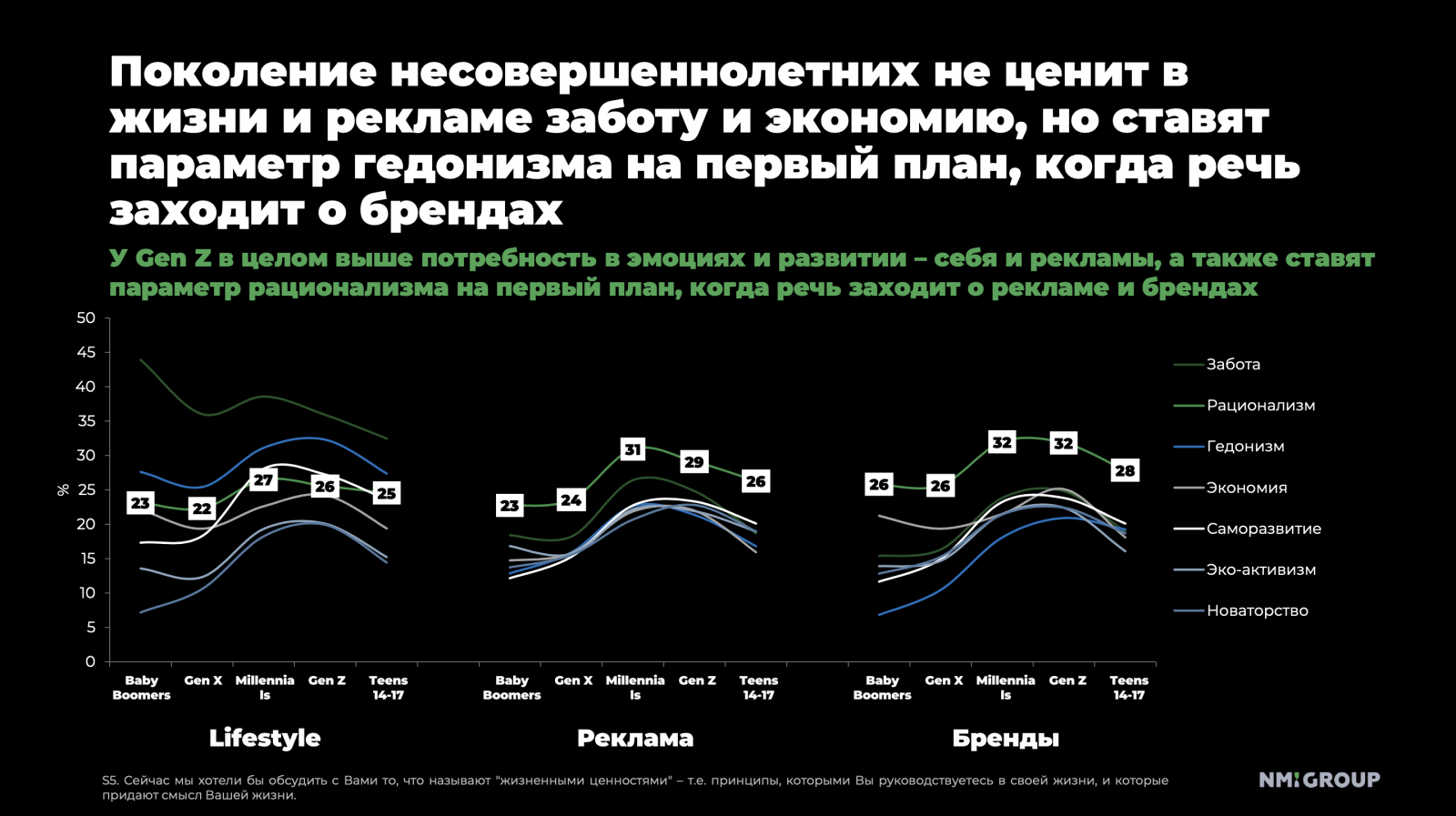 Подростки — выраженные гедонисты: доля параметра «гедонизм» в системе их ценностей достигает 32%, существенно опережая «рационализм» (26%) и «заботу» (23%). Молодые люди не ценят в рекламе «экономию ради экономии» — они хотят эмоций и красивой жизни. К таким выводам пришли специалисты NMi Group и Product Hub, которые опросили респондентов в возрасте от 14 до 24 лет. Результаты опроса есть в распоряжении Sostav.