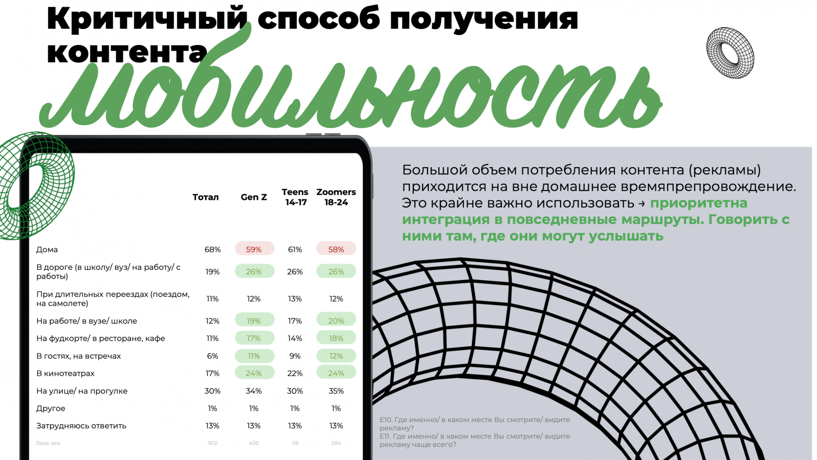 При этом подростки потребляют контент преимущественно дома (61%). Но вместе с тем обширный пласт рекламных контактов происходит «на ходу»: в дороге (26%), на прогулках (30%), в кинотеатрах (22%), на работе/вузе/в школе (17%). Для брендов это означает необходимость интеграции в повседневные маршруты, говорят специалисты NMi Group и Product Hub.