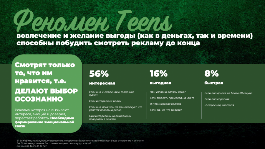 Подростковый мозг биологически настроен на немедленное вознаграждение: они крайне чувствительны к быстрой и выгодной рекламе, где результат можно получить в буквальном смысле «здесь и сейчас», будь то удовлетворение интереса или какая-либо другая выгода (суммарно 24% факторов досматривания (16% — если реклама выгодная, 8% — если реклама быстрая), но 56% готовы смотреть ролик до конца только при условии, что он интересен сам по себе, и есть мотивация его досмотреть.