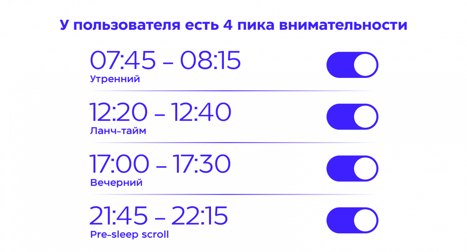 - Целевой хронотип аудитории — графики сна и отдыха, тайминги медиапотребления. Например, если ваши пользователи — белые воротнички, то скорее всего, они активно потребляют контент утром во время завтрака. Если геймеры — то, наоборот, поздним вечером и даже ночью.