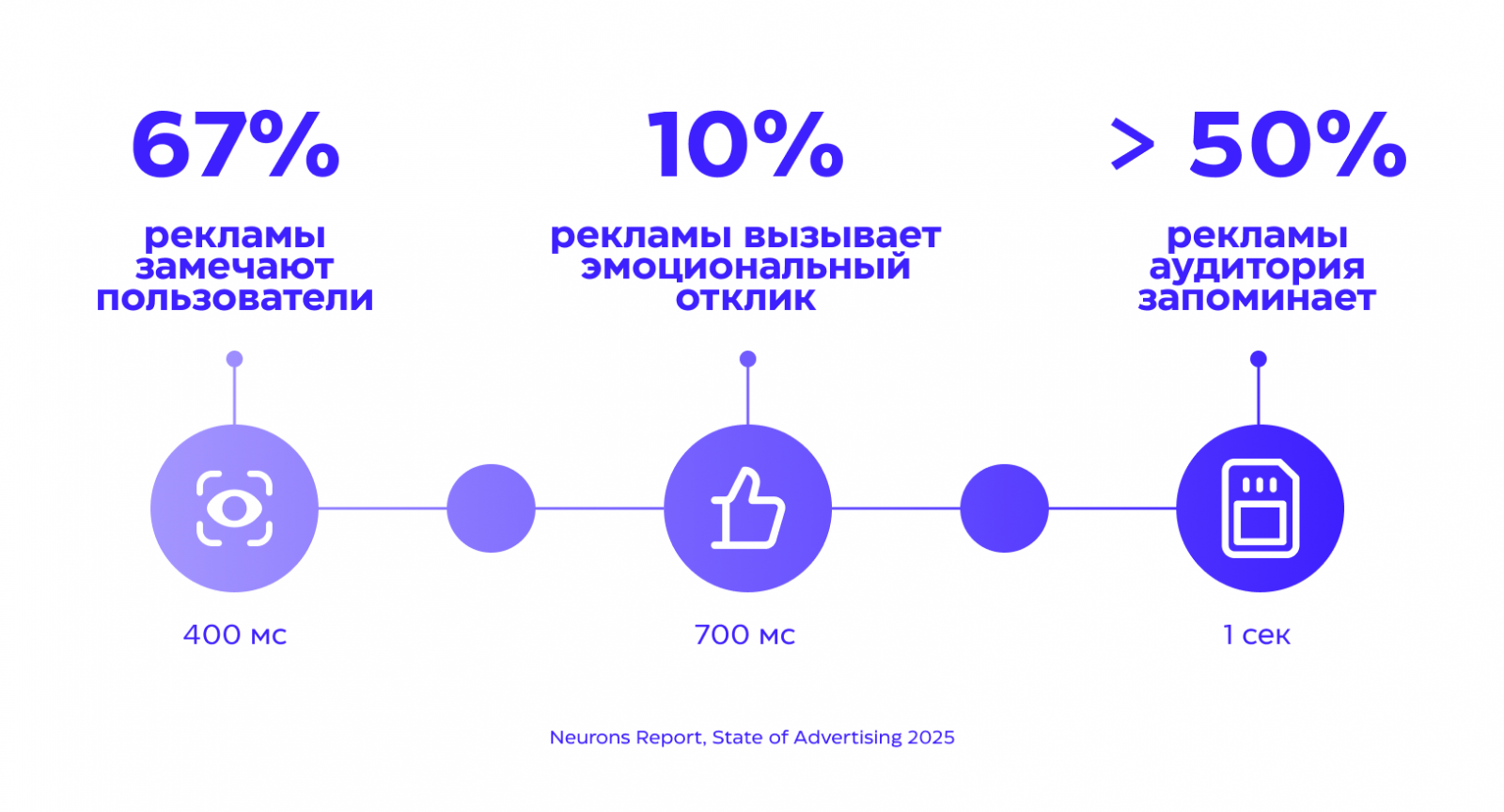 А чтобы запомниться, вам понадобится три секунды — именно столько времени нужно человеку, чтобы считать одно сообщение. Правда, 75% рекламных креативов в диджитале не достигают цели за это время, то есть весомая часть бюджетов расходуется неэффективно.