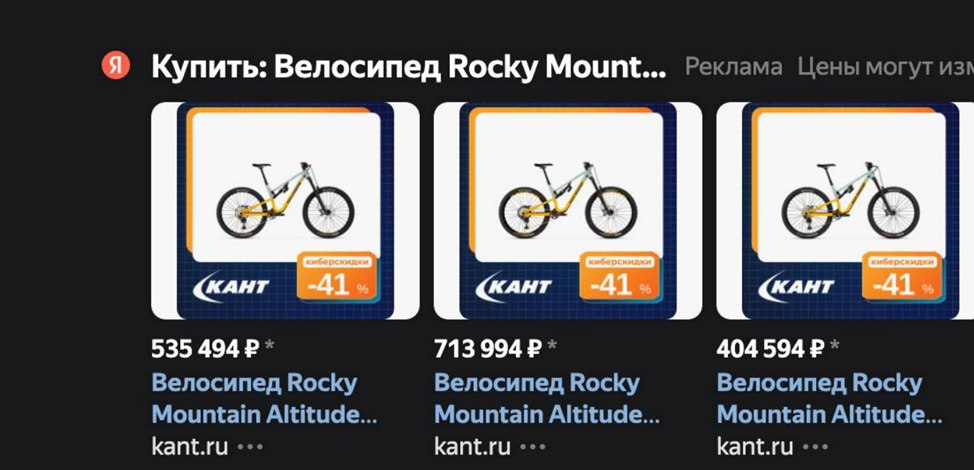 В качестве решения мы предложили протестировать внедрение брендированного фида. Карточки товаров, разработанные в соответствии с фирменным стилем, визуально выделялись на фоне стандартных объявлений, отражая айдентику бренда и используя корпоративные цвета. Это позволило оказать положительное влияние на показатели кликабельности и конверсии. Ниже представлен пример, демонстрирующий внешний вид брендированных карточек «Канта».