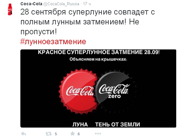 Пользователи соцсетей по всему миру активно комментировали это событие, используя хэштег #SuperBloodMoon. Не прошли мимо и мировые бренды - ведь такое событие произошло впервые за 30 лет. Sostav.ru собрал самые интересные кейсы, связанные с «восходом кровавой луны».