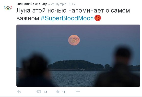 Символичной иконкой были помечены и забавные посты мировых брендов и организаций, использующих «суперлуние» для своего продвижения. Оргкомитет Олимпийский игр, в частности, разместил на луне свой логотип.