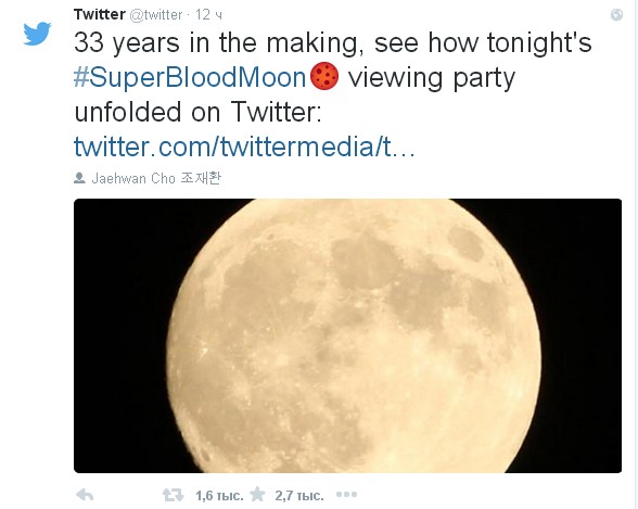 Соцсеть Twitter отликнулась на редкое астрономическое событие иконкой «суперлуния», которая автоматически добавляется ко всем постам с хэштегом #SuperBloodMoon.
