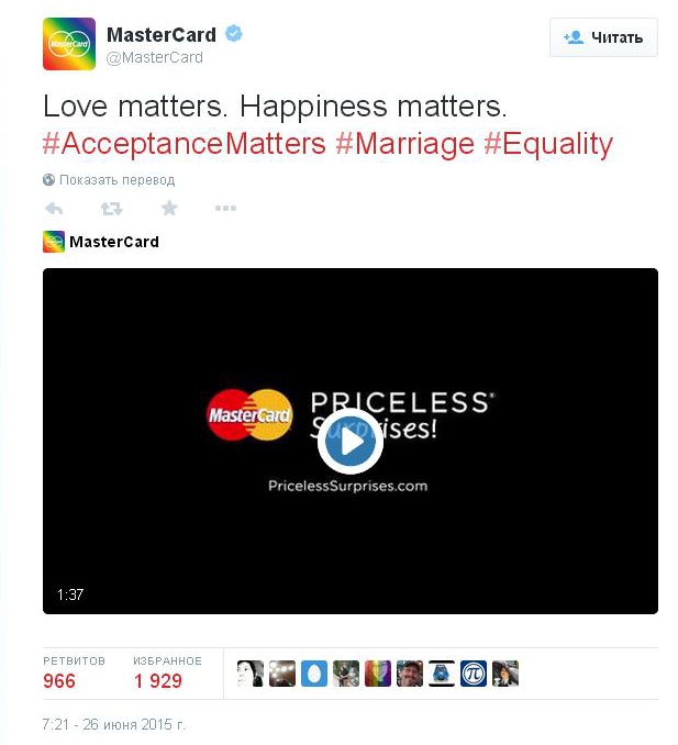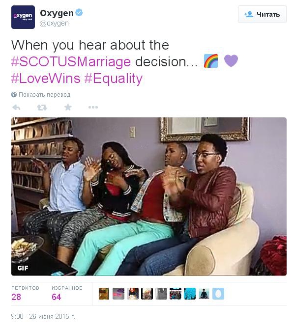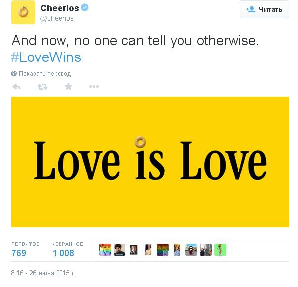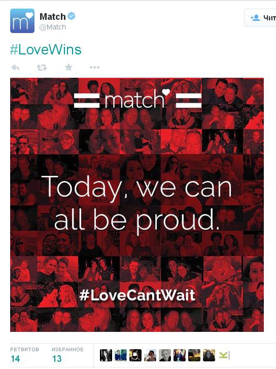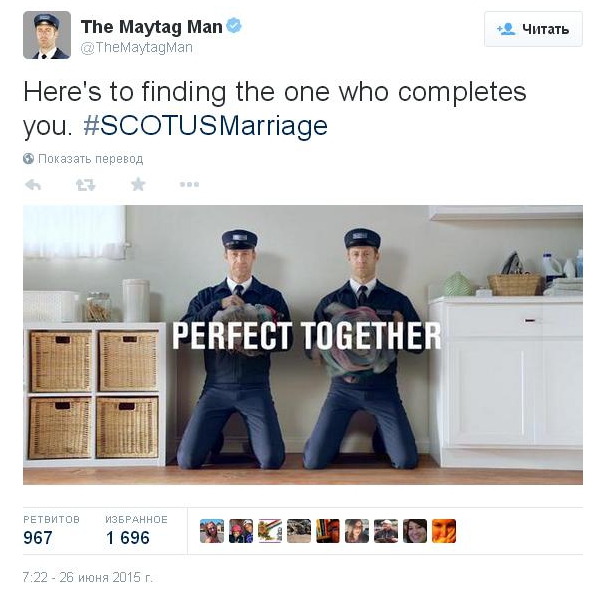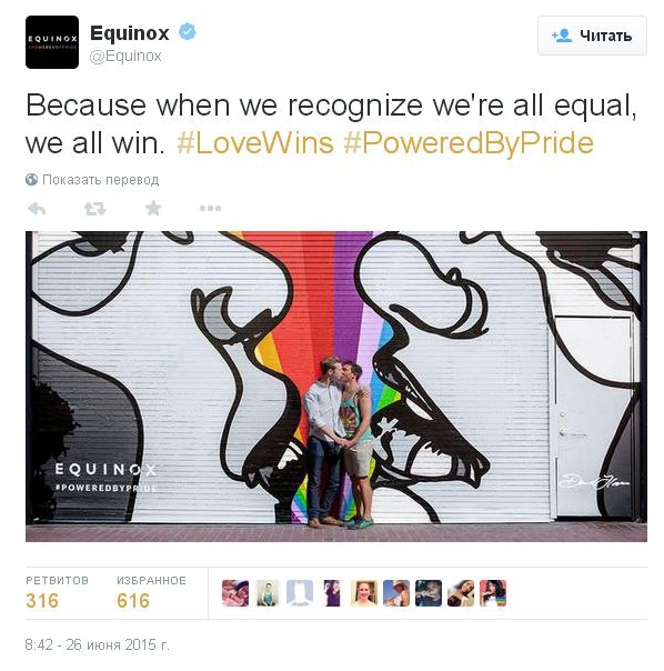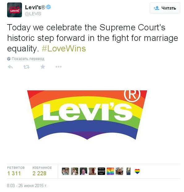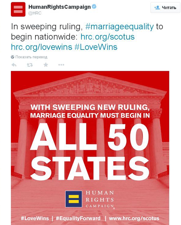 В пятницу Верховный суд США легализовал однополые браки во всех штатах США. Президент США Барак Обама назвал решение суда «победой для Америки», которая сделала миллионы американцев более свободными. Пользователи соцсетей по всему миру стали активно комментировать это событие, используя хэштег #LoveWins. Sostav.ru совместно с соцсетью Twitter собрал мнения мировых брендов, которые наряду со своими читателями оперативно реагировали на социально значимое событие.