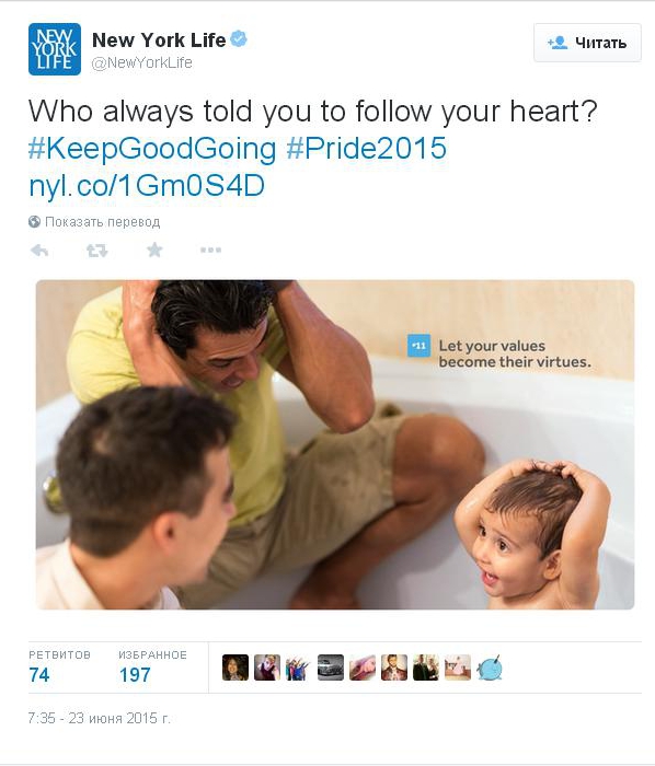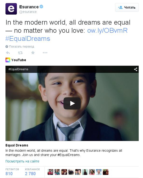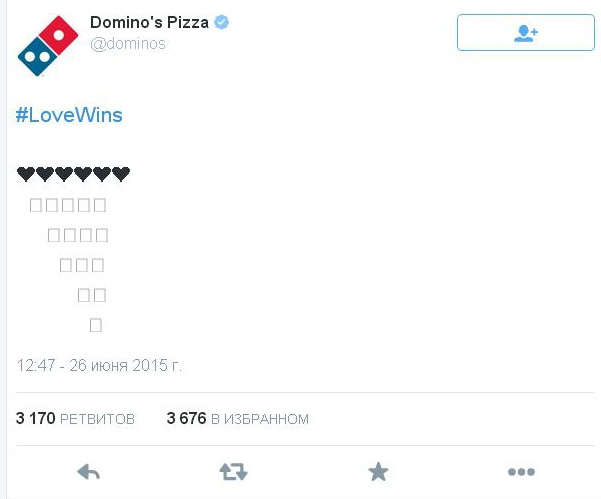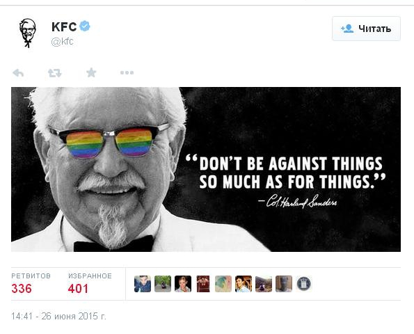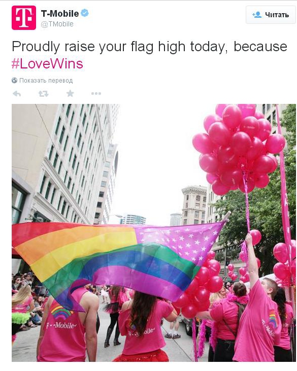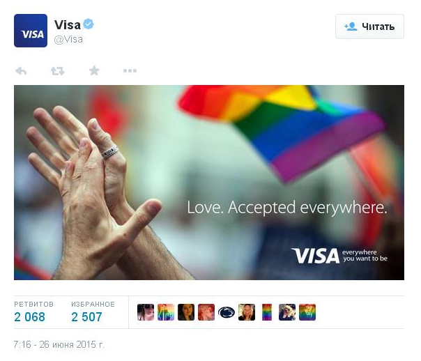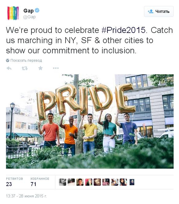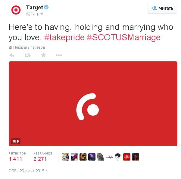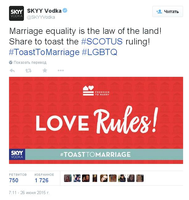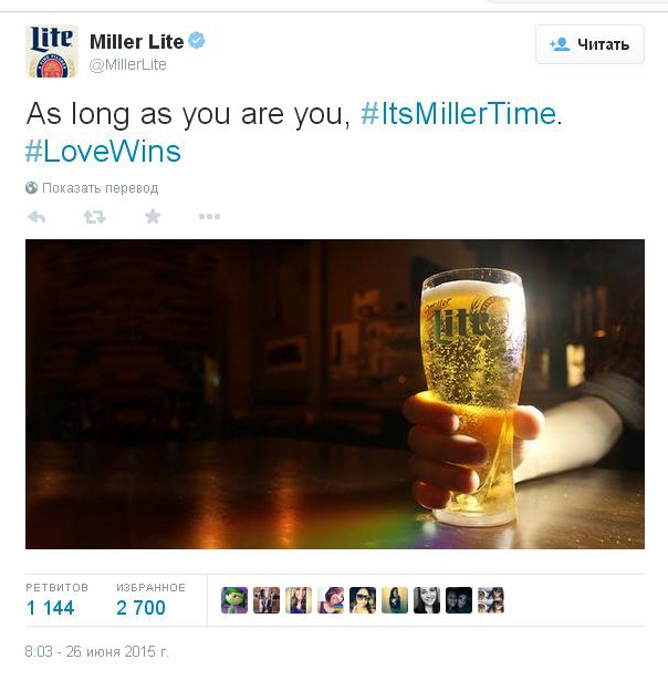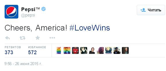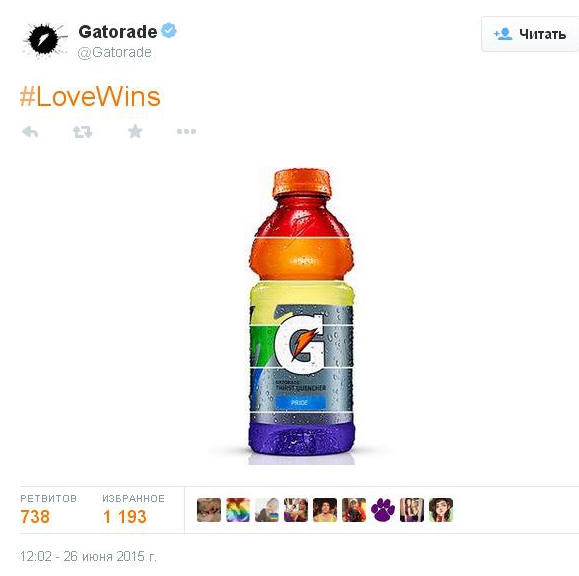 Мировые бренды в Twitter оперативно отреагировали на историческое решение и решили в этот момент обратиться к своей аудитории из числа ЛГБТ и их сторонников. Тональность этой коммуникации была разной – остроумной, эмоциональной, но всегда – позитивной. Некоторые бренды поставили радугу в аватарках. Некоторые опубликовали видео об их собственных усилиях в защиту прав ЛГБТ-сообщества. Некоторые даже переименовали свою продукцию в честь этого события.