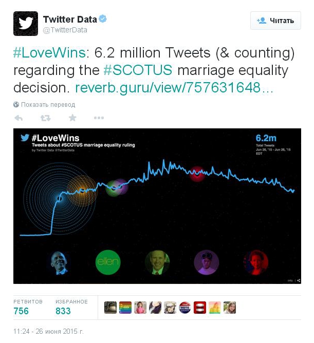 Официальный твиттер Twitter Data откликнулся на решение интерактивной картой, как пользователи социальной сети ретвитили Обаму и других политиков, высказавшихся в своих аккаунтах в поддержку решения Верховного суда.