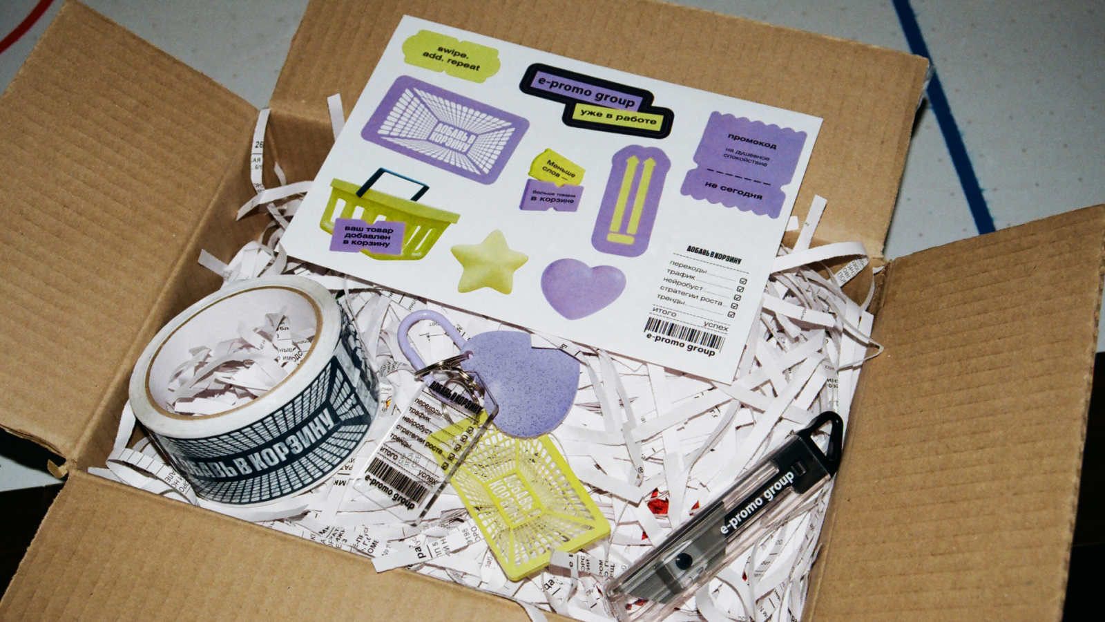 Концепцию митапа продолжили в welcome-наборах: авоська с брендированной коробкой, оклеенной фирменным скотчем и стикерами. Так E-Promo Group выдала гостям набор «гейм-ченджер» со всем необходимым для работы с маркетплейсами:
